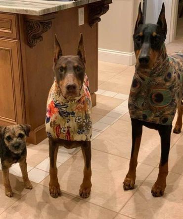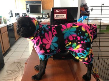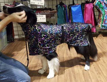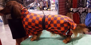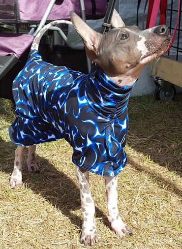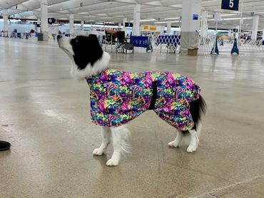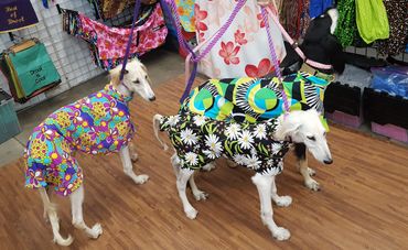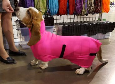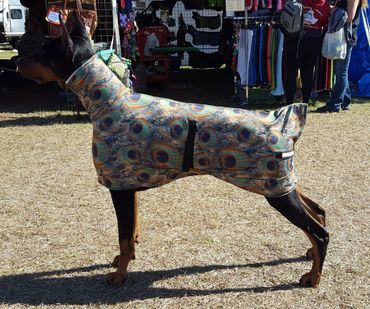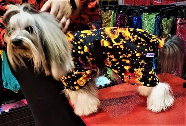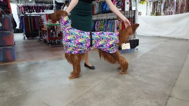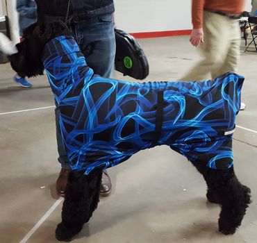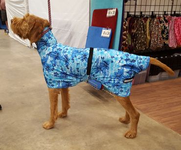 Now the Sleezy™ makes it easy to get rid of the back curl and or wave from any coat. Made from nylon-lycra fabric these dog drying coats assist in smoothing the top-line by its sheer tightness. These show dog drying coats can also be used as a cool coat in the summer. It goes on over the head and attaches under the belly and behind the back legs with hook and loop. No more pins! There are many solid colors as well as printed fabrics to choose from. This is the original smoothing/drying coat (made by CJ Crafts for over 20 years).